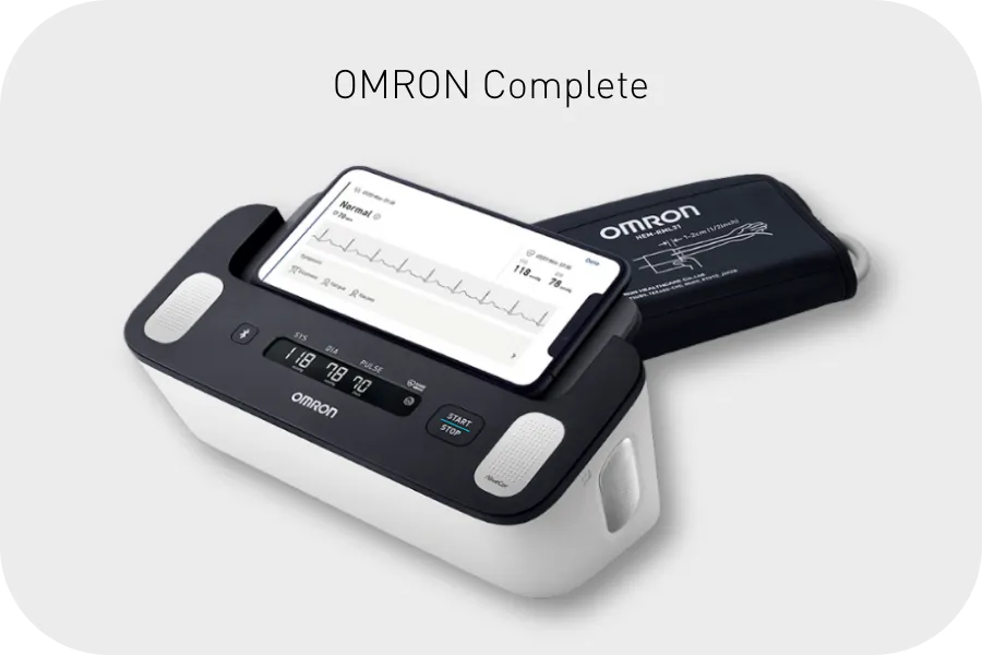 OMRON Complete je inováciou, ktorá spája výhody EKG aj AFib detekcie v jednom. Vďaka zabudovanému EKG snímaču a prepojeniu so smartfónom dokáže užívateľ zaznamenať 1-zvodové EKG a odhaliť nepravidelnosti v rytme srdca, všetko v domácom prostredí.